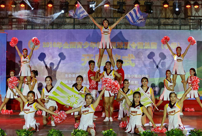 8月8日,秦皇島市第五中學(xué)健美操隊(duì)在開營儀式上表演足球拉拉操《舞動青春》。當(dāng)日,2016年全國青少年校園足球夏令營總營(小學(xué))在國家體育總局秦皇島訓(xùn)練基地(中國足球?qū)W校)開營。該夏令營由全國青少年校園足球工作領(lǐng)導(dǎo)小組辦公室主辦,河北省教育廳、秦皇島市人民政府承辦。活動為期10天,將有全國31個省區(qū)市和新疆生產(chǎn)建設(shè)兵團(tuán)的448名少年足球運(yùn)動員入營參加訓(xùn)練和比賽。新華社記者楊世堯攝