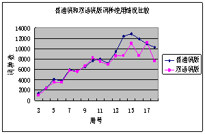 兩套教材每?jī)?cè)課文用詞和詞干的調(diào)查數(shù)據(jù)顯示:隨著年級(jí)增長(zhǎng),課文使用詞干、詞種均呈穩(wěn)步增長(zhǎng)態(tài)勢(shì),符合學(xué)生的認(rèn)知規(guī)律。兩套教材對(duì)比,普通班版教材的課文用詞隨年級(jí)冊(cè)號(hào)的變化曲線上升相對(duì)平穩(wěn),課文的詞干種與詞種數(shù)量相對(duì)較大,而雙語(yǔ)班版教材課文用詞,特別是中學(xué)階段用詞變化曲線相對(duì)起伏較大,詞種數(shù)量相對(duì)較小。