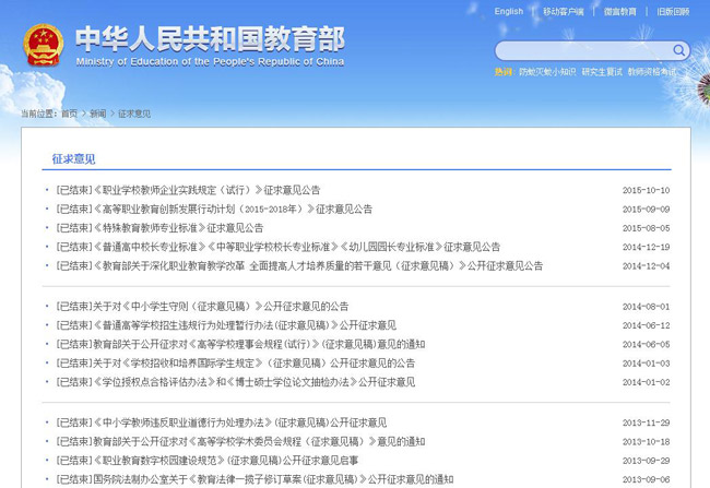 2. 推動決策過程公開。制定的《特殊教育教師專業(yè)標準》《高等職業(yè)教育創(chuàng)新發(fā)展行動計劃(2015-2018年)》《職業(yè)學校教師企業(yè)實踐規(guī)定(試行)》等3項重要規(guī)范性文件草案均在門戶網(wǎng)站征求意見專欄向全社會公開征求意見,其中2項在廣泛聽取了社會各方意見建議并修改完善后正式發(fā)布。在編制起草《普通高等學校高等職業(yè)教育(??疲I(yè)設置管理辦法》《教育部重點實驗室建設與運行管理辦法》《中小學生藝術素質(zhì)測評辦法》等重要文件時,廣泛聽取了社會各方意見建議。在門戶網(wǎng)站征集教育“十三五”規(guī)劃建議建言,加強公眾參與。