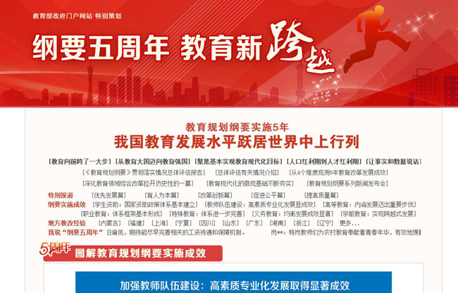 3. 推進執(zhí)行情況和執(zhí)行結果公開。一是公開教育規(guī)劃綱要落實情況。在網(wǎng)站開設專題專欄,整合媒體報道、專家觀點、采訪調(diào)研、群眾聲音等內(nèi)容,系統(tǒng)公開推動協(xié)調(diào)發(fā)展、推進改革開放、提高教育質(zhì)量、促進教育公平等方面改革發(fā)展進展和成果。召開8次教育規(guī)劃綱要實施5周年系列新聞發(fā)布會,分專題向社會介紹5年來綱要實施成效。二是公開重點工作進展。在門戶網(wǎng)站開設專題,公開“深化高等學校創(chuàng)新創(chuàng)業(yè)教育改革”“推進世界一流大學和一流學科建設”“鄉(xiāng)村教師支持計劃”“全面實施教育扶貧全覆蓋行動”“首屆中國‘互聯(lián)網(wǎng)+’大學生創(chuàng)新創(chuàng)業(yè)大賽”“職業(yè)院校管理水平提升行動計劃”“首屆全國中小學生電影周”等重點工作和重大項目進展。三是公布重點工作結果。公布2015年全國高等學校名單,國家級大學生創(chuàng)新創(chuàng)業(yè)訓練計劃項目名單,全國青少年校園足球特色學校及試點縣(區(qū))遴選名單等,方便社會公眾知曉。公開“長江學者獎勵計劃”“千人計劃”等重大人才項目情況,對教育部評選的全國教育系統(tǒng)先進集體和先進個人以及推薦的“全國杰出專業(yè)技術人才”“百千萬人才工程”等人選進行公示,接受社會監(jiān)督。