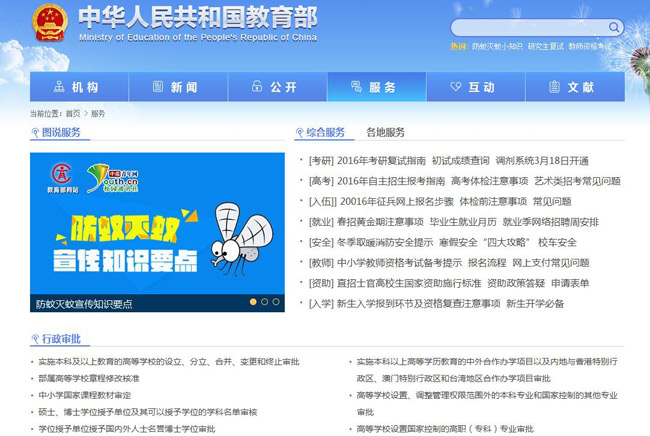 2.通過門戶網(wǎng)站發(fā)布熱點信息情況。分別于4月、7月通過門戶網(wǎng)站公開教育部2015年部門預算和2014年部門決算,進一步細化預決算公開內(nèi)容。公開“三公”經(jīng)費決算,包括因公出國(境)團組數(shù)及人數(shù),公務用車購置數(shù)及保有量,國內(nèi)公務接待的批次、人數(shù),以及“三公”經(jīng)費增減變化原因等信息。發(fā)布《2014年全國教育事業(yè)發(fā)展統(tǒng)計公報》《2014年全國教育經(jīng)費執(zhí)行情況統(tǒng)計公告》,編印出版年度《中國教育發(fā)展報告》,定期更新公布全國及分省各級各類學校(機構)情況、學生情況、教職工情況、專任教師情況等相關教育事業(yè)統(tǒng)計數(shù)據(jù),發(fā)布年度中國語言生活狀況報告,積極開展社會語言生活狀況的跟蹤監(jiān)測與引導。及時公開調(diào)整、減少行政審批事項的信息,在門戶網(wǎng)站全面發(fā)布目前保留的11項行政審批事項,公布服務指南、審查細則和審批服務規(guī)范,列明政策依據(jù)、申請條件、辦理程序、辦理時限、受理機構等內(nèi)容,加強審批結果公開。已核準的15所高等學校章程、2015年高等職業(yè)學校專業(yè)設置備案結果、普通高等學校本科專業(yè)備案或?qū)徟Y果等都在門戶網(wǎng)站信息公開專欄向社會公示。