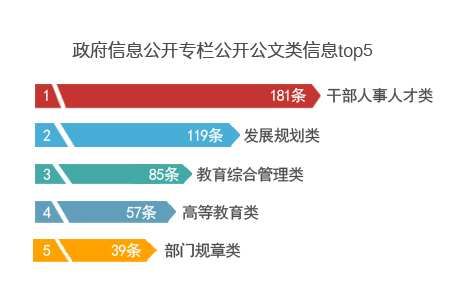 1. 通過公開專欄公開信息情況。通過政府信息公開專欄公開公文類信息共計507條,教育部政策公文中非涉密普發(fā)下行文78% 做到了主動公開。其中位于前5位的信息是:干部人事人才類181條,占比35.70%;發(fā)展規(guī)劃類119條,占比23.47%;教育綜合管理類85條,占比16.77%;高等教育類57條,占比11.24%;部門規(guī)章類39條,占比7.69%;其他26條,占比5.13%。