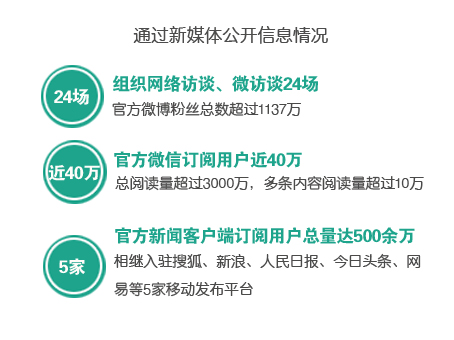 5.通過新媒體公開信息情況。加強新媒體運用和媒體聯(lián)動,探索官方微博、微信、新聞客戶端及門戶網(wǎng)站、教育報、教育臺聯(lián)動的新聞發(fā)布模式,做好新聞發(fā)布、熱點回應、信息服務等工作。組織網(wǎng)絡訪談、微訪談24場;官方微博粉絲總數(shù)超過1137萬;官方微信訂閱用戶近40萬,總閱讀量超過3000萬,多條內(nèi)容閱讀量超過10萬;官方新聞客戶端已相繼入駐搜狐、新浪、人民日報、今日頭條、網(wǎng)易等5家移動發(fā)布平臺,訂閱用戶總量達500余萬。