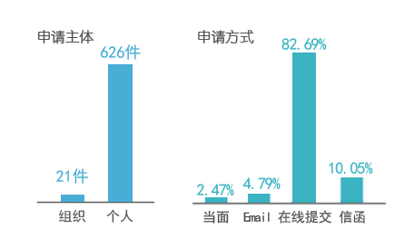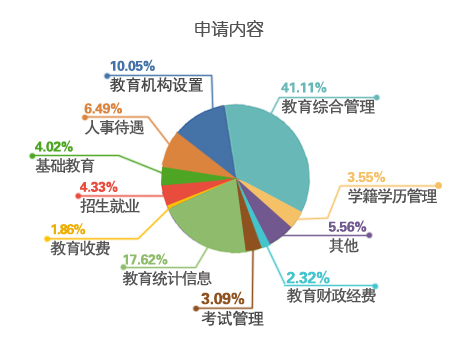1.申請情況。1月1日至12月31日,共收到公民、法人和其他組織通過各種形式提出的信息公開申請647件,較2014年的281件增長了130%。從申請的主體看,公民個人提出的申請626件、其他組織提出的申請21件。從申請方式看,當面申請16件,占2.47%;以電子郵件方式申請31件,占4.79%;以紙質(zhì)信函方式申請65件,占10.05%;以在線提交方式申請535件,占82.69%。涉及教育綜合管理的266件,占41.11%;涉及教育統(tǒng)計信息的114件,占17.62%;涉及教育機構設置的65件,占10.05%;涉及人事待遇的42件,占6.49%;涉及招生就業(yè)的28件,占4.33%;涉及基礎教育的26件,占4.02%;涉及學籍學歷管理的23件,占3.55%;涉及考試管理的20件,占3.09%;涉及教育財政經(jīng)費的15件,占2.32%;涉及教育收費的12件,占1.86%;其他36件,占5.56%。申請內(nèi)容涉及教育部20個業(yè)務司局。