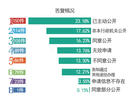 2.答復情況。647件申請已全部按時答復申請人,其中“已主動公開”的150件,占23.18%;“同意公開”的105件,占16.23%;“同意部分公開”的1件,占0.15%;“不同意公開”的86件,占13.30%;“不屬于本行政機關公開”的114件,占17.62%;“申請信息不存在”的23件,占3.55%;“告知通過其他途徑辦理”的79件,占12.21%,無效申請89件,占13.76%)。
